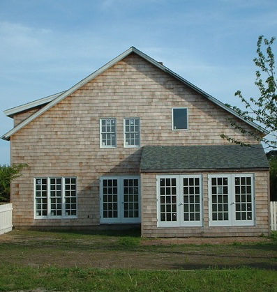 Working as a team with the artist/owner of the property, we designed this two story house with large open spaces for summer living and an environmentally sustainable structure. The large deck at the rear of the house is entered from the living room through large custom doors with full opening screens that retract into the walls. A small gazebo at the end of the deck allows for a private outdoor reading room for the owners.